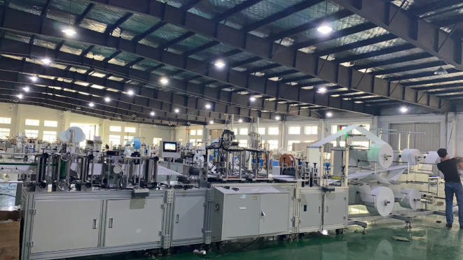本机台是全自动立体折叠口罩一体机。从布料入料到成品完全自动化,包括(上鼻梁条,印字),松紧带点焊,对折,成型熔接和成品切断,废料排除,成品输出完全实现了在一台机器上自动化生产,整台机器只需要一人操作。